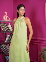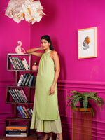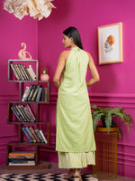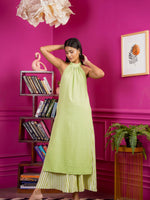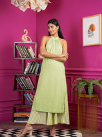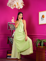 Get ready to stun in this lovely green kurta set. This set includes a green print halter neck kurta with white and green fabric elasticated palazzo pants that adds a dainty and feminine touch.
