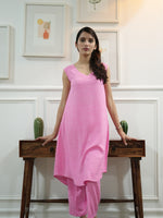 Get that effortlessly cool vibe on-point with this kurta pant set. Designed in pink cotton fabric  with sleeveless design, v-neckline, pockets on each side. Completed with elasticated pants. Style with jewelry and your...