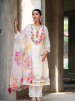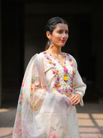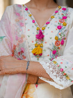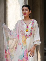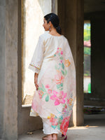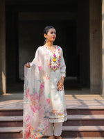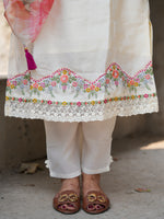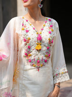 Be the centre of attention all season long with our white kurta set. Made with luxe fabric, this features a straight kurta with elbow length sleeves and dupatta. This set is completed with elasticated pants.