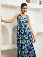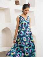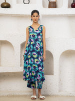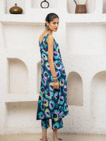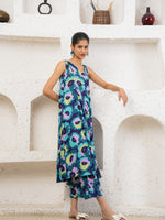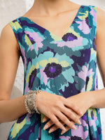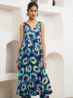 This vibrant suit set is a celebration of carefree elegance. Crafted in a breezy, flowy silhouette, it features a sleeveless, V-neck kurta adorned with bold, abstract floral prints in striking shades of teal, violet, lime, and deep blue. The kurta cascades gracefully, offering effortless movement and a playful yet refined charm. Paired with matching straight pants, the ensemble feels fresh, modern, and perfect for summer soirées or leisurely days out. Statement earrings and minimal sandals complete the look, letting the rich colors and lively patterns take center stage. This set beautifully marries comfort with standout style.