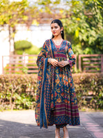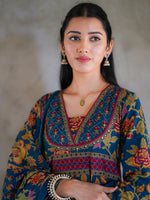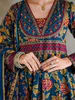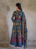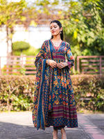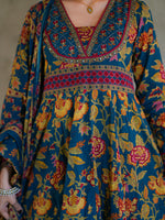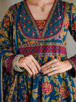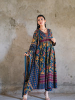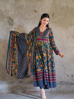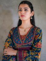 Introducing an enchanting masterpiece, this suit epitomizes elegance and tradition. Crafted in a rich blend of vibrant blue and earthy hues, it boasts intricate floral and geometric patterns that exude timeless charm. The flowing silhouette...
