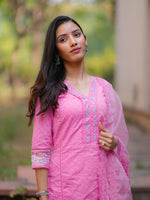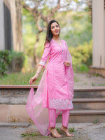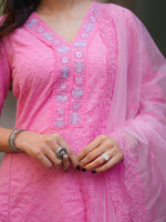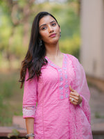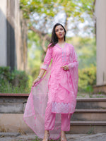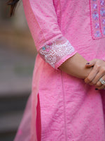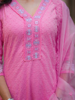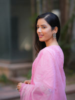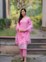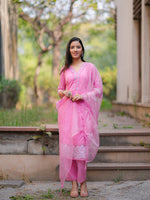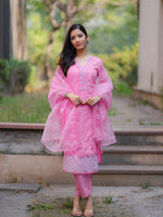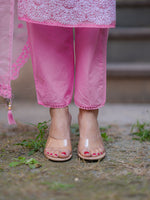 This enchanting pink suit is a vision of elegance and grace. Crafted from delicate fabric, it features intricate embroidery that adds a touch of sophistication. The V-neck kurta, adorned with dainty embellishments, exudes timeless charm, while the scalloped lace hem enhances its feminine appeal. The sheer organza dupatta flows effortlessly, adding a dreamy, ethereal vibe to the ensemble. Paired with sleek pants, this outfit strikes the perfect balance between tradition and modern elegance. Light, airy, and effortlessly chic, this suit is perfect for festive occasions, intimate gatherings, or a sunlit day out, making you feel radiant and poised.