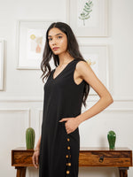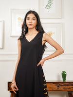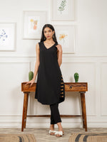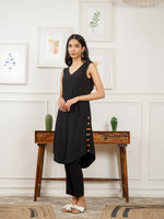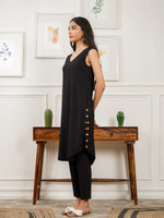 Get that effortlessly cool vibe on-point with this kurta pant set. Designed in black fabric with sleeveless design, v-neckline, pockets on each side and buttons on the left side. Completed with elasticated pants.