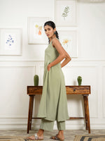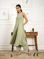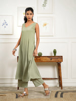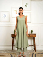 Fun and flirty, our mint green sleeveless kurta set is designed for your shopping dates to brunch dates where you will be the center of attention. Made in mint green fabric with front pleat details, v-neckline and pockets on both side. Completed with elasticated pants.