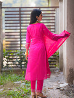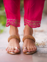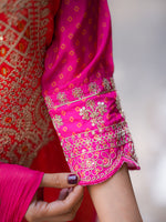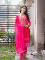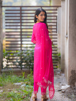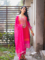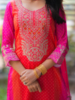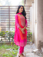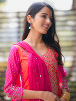 This vibrant suit set is a stunning celebration of colors and craftsmanship. The kurta features an exquisite mix of pink and orange hues, highlighted with intricate mirror and thread embroidery, creating a rich festive look. The straight-cut silhouette paired with a lightweight, embellished dupatta adds elegance and grace to the outfit. Fine detailing on the sleeves and hem enhances its traditional charm, making it perfect for festive occasions, weddings, or cultural gatherings. Styled with delicate jhumkas and traditional sandals, this outfit beautifully blends modern freshness with timeless ethnic elegance, making every step radiate confidence and joy.
