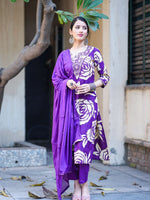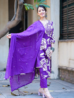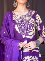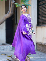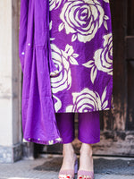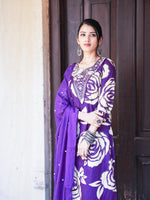 Embrace timeless elegance with our exquisite purple kurta set. The kurta, adorned with a delicate white floral pattern, is paired with matching pants for a cohesive look. A flowing purple dupatta adds an extra layer of sophistication. Accessorized with shimmering silver jewelry and complemented by stylish pink heels, this ensemble is designed to make a statement. Whether it's a festive celebration or a special occasion, this suit set promises to turn heads and celebrate your unique style.