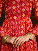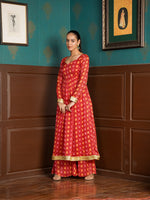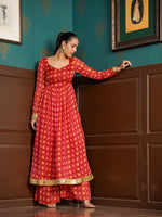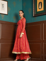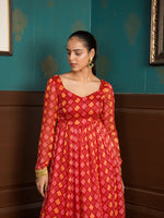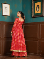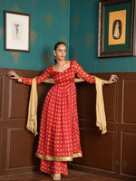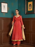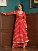 Elevate your celebratory style with this rich shade of red Anarkali kurta set designed for festive wear.